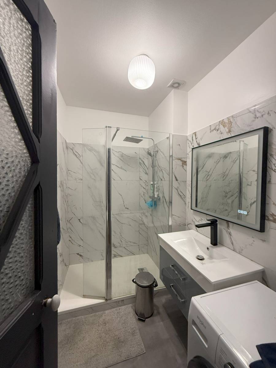 entrée, beau séjour-salon, cuisine équipée, trois chambres dont une avec douche, une salle d'eau avec douche et vasque.
