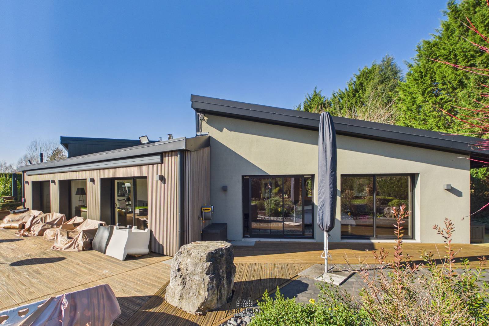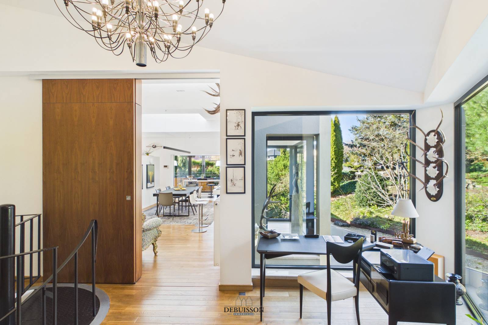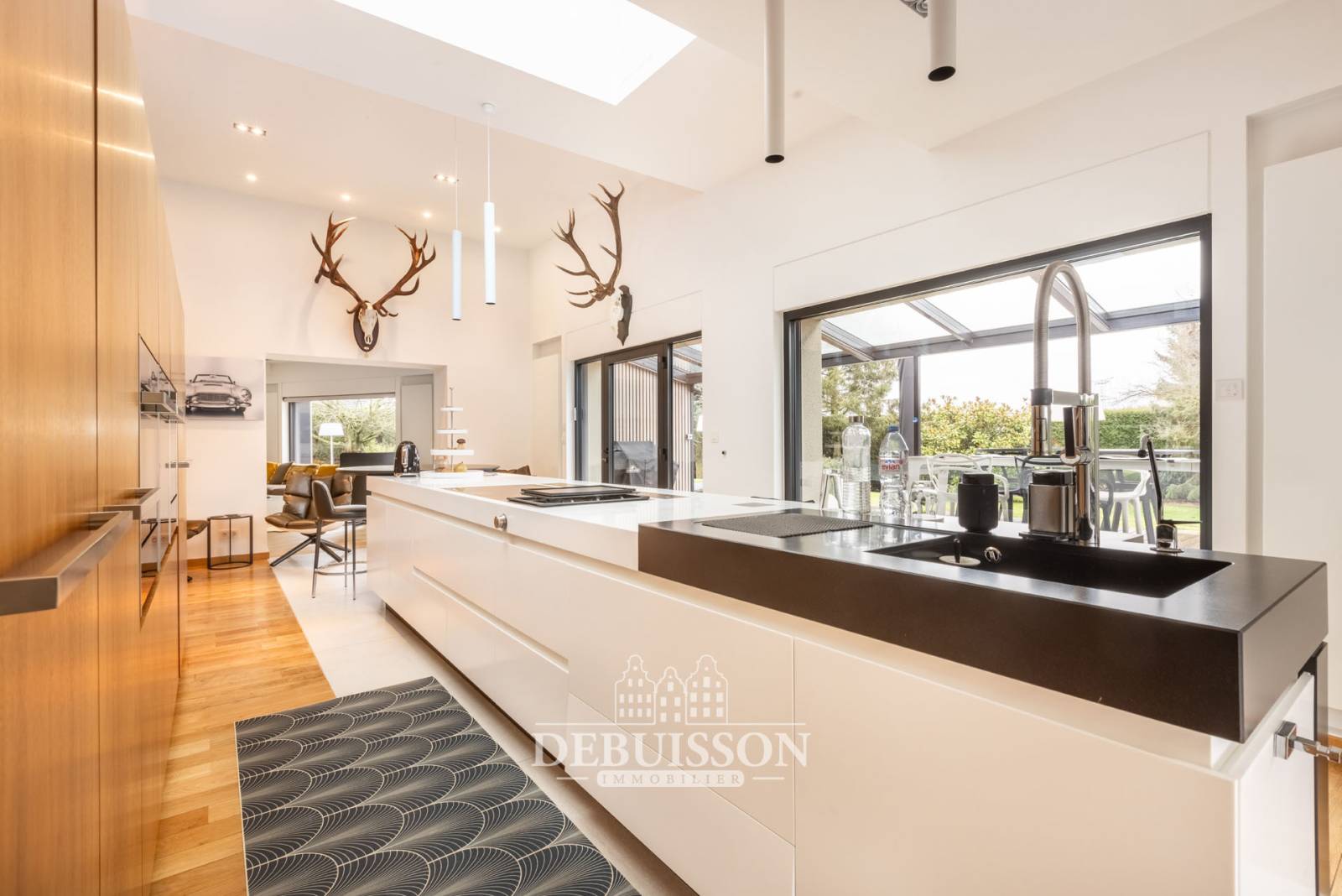 Les volumes sont agréables , elle dispose d'un rez-de-chaussée avec une cuisine moderne tournée vers le jardin et sa terrasse, un espace détente avec son poèle à bois, le bar offre un bow window et une salle-à-manger spacieuse, un salon baigné de lumière donnant sur la terrasse et la piscine chauffée, une masterbedroom avec ses placards de rangement donnant sur une nouvelle terrasse exposée au soleil levant, une salle de bains avec doubles vasques en corian, une baignoire posée dans le bow window avec vue sur le jardin d'agrément, une vaste douche et un dressing.