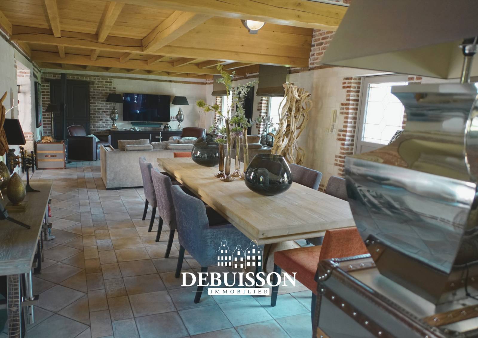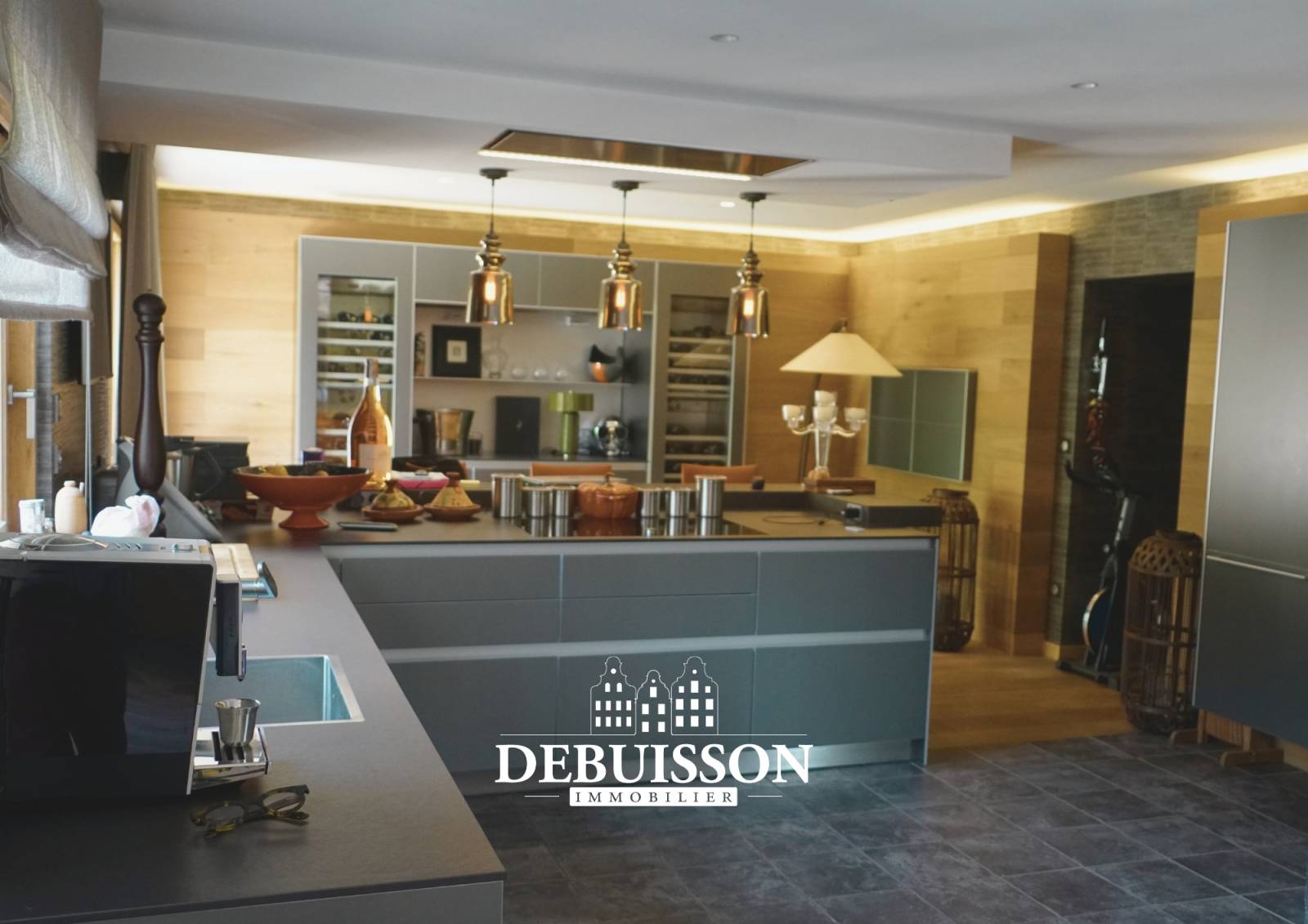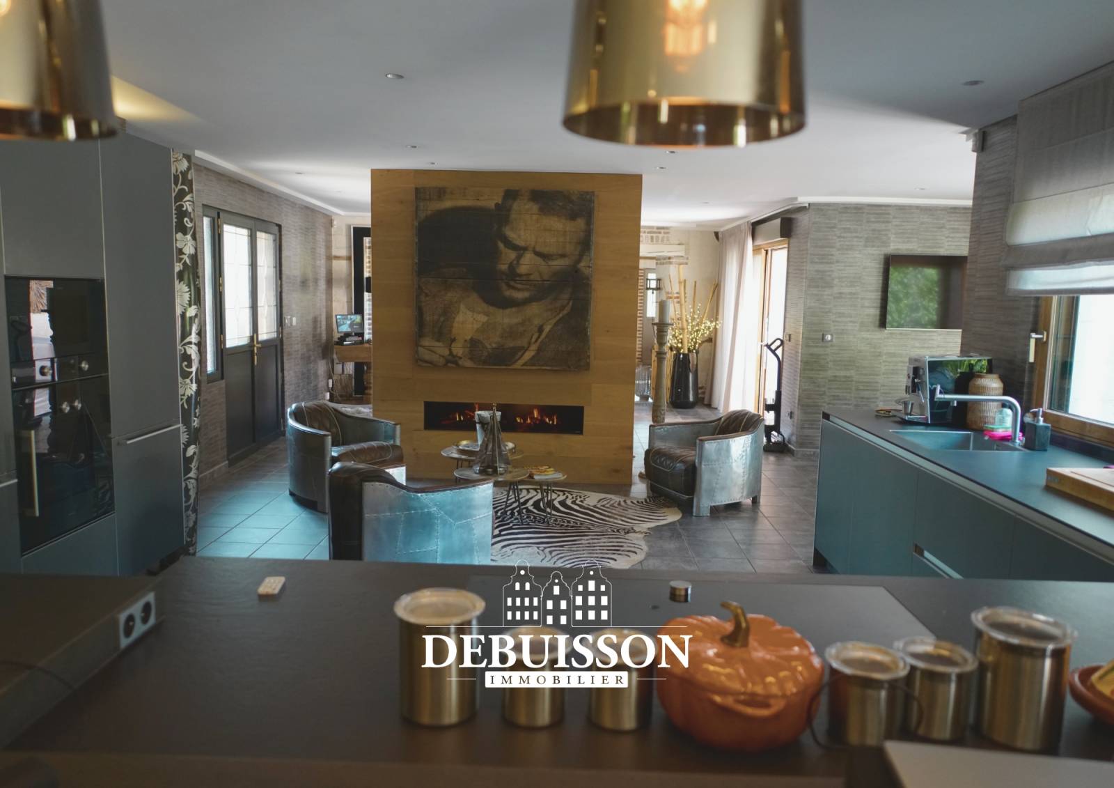 et comprend une pièce de réception de 85 m2 avec sa cheminée feu de bois, une cuisine équipée qualitative et haut de gamme donnant sur son espace repas,