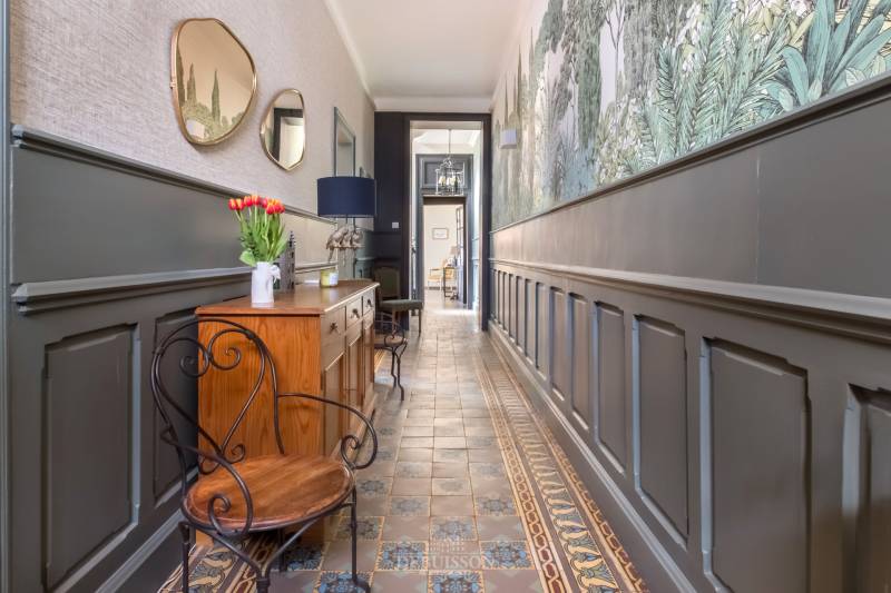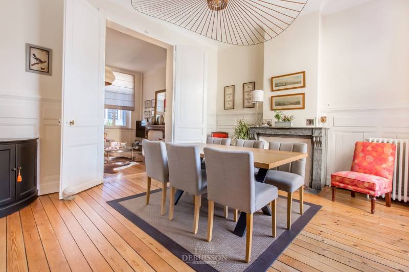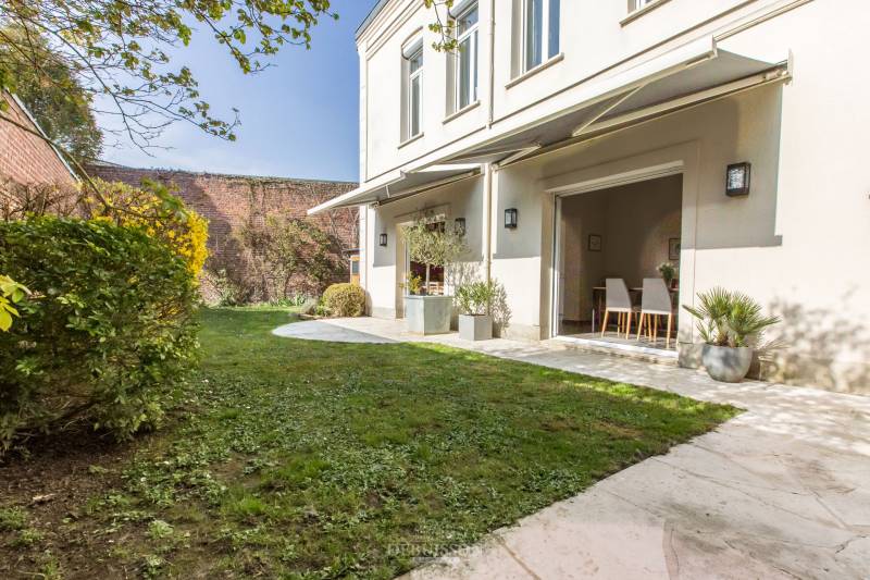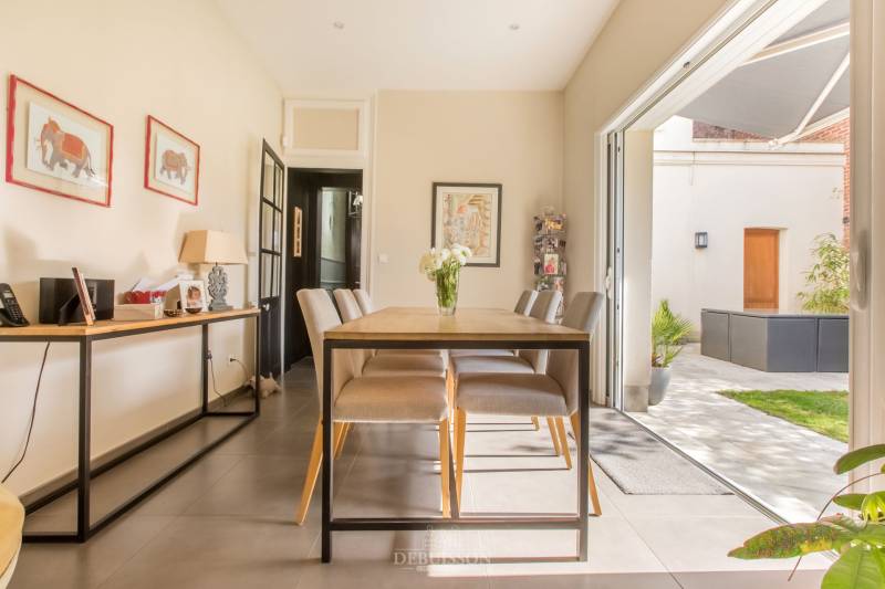 Vous trouverez cette maison bourgeoise avec une seule mitoyenneté, avec garage et jardin bien exposé et clos, comprenant une vaste entrée, donnant sur l'espace séjour et salon traversant, avec cheminée marbre et un sol parquet, une vaste cuisine équipée et son espace repas donnant sur la terrasse exposée plein sud avec des ouvrants baie vitrée à galandage, un wc à chaque étage,