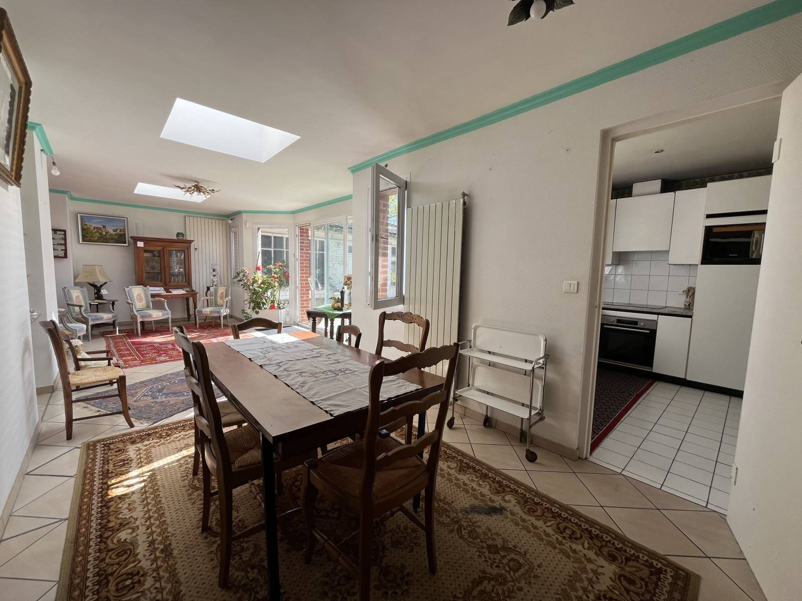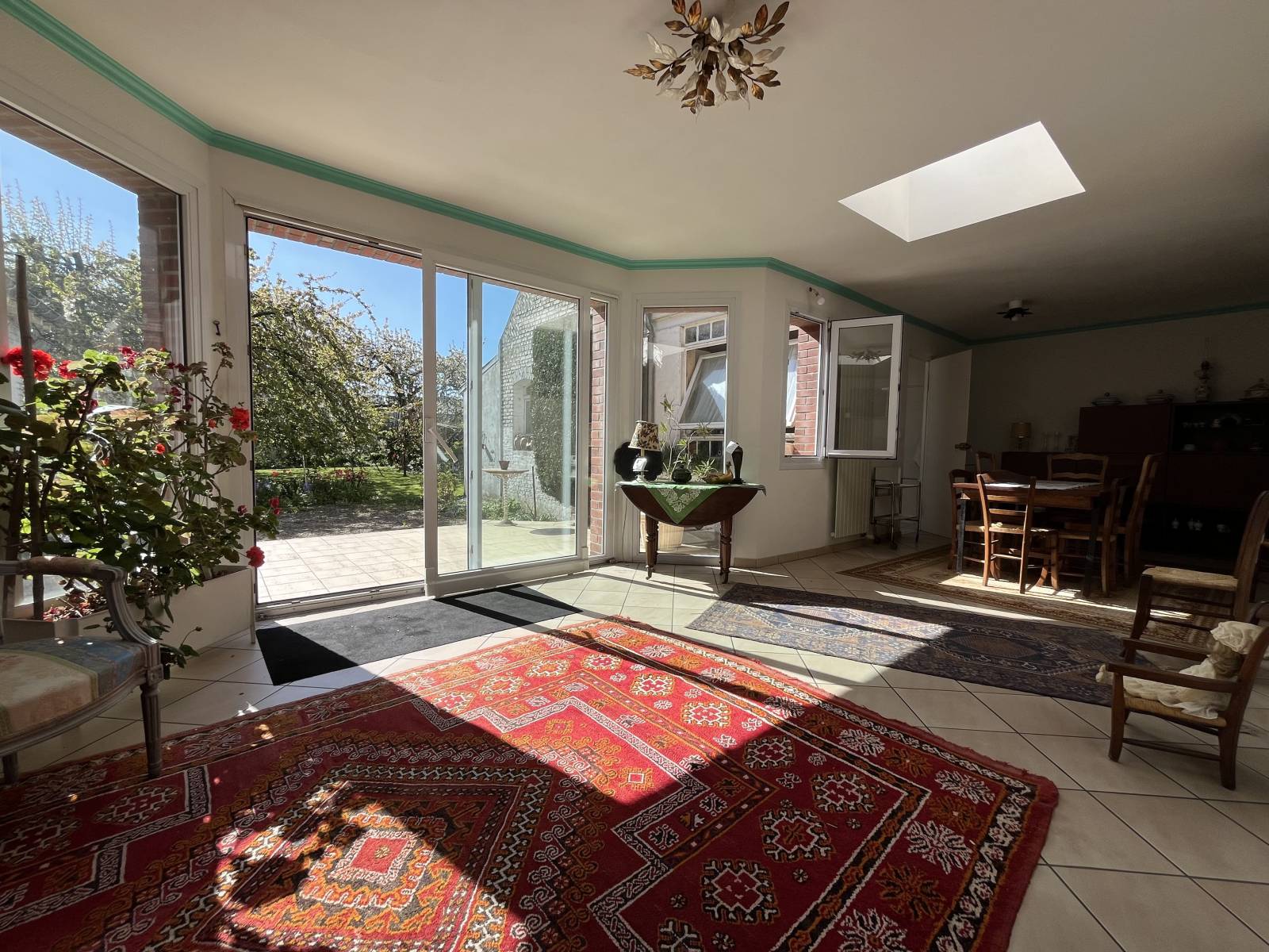 Vous bénéficierez également d'une terrasse carrelée, d'un jardin arboré orienté sud-est, d'un très grand garage de 57 m² et d'une cave.